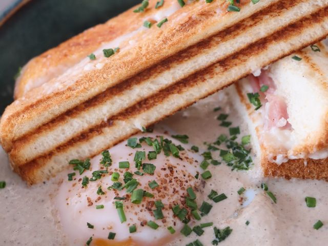 Oeuf parfait, crème de champignons truffées, croque jambon à la truffe d'été