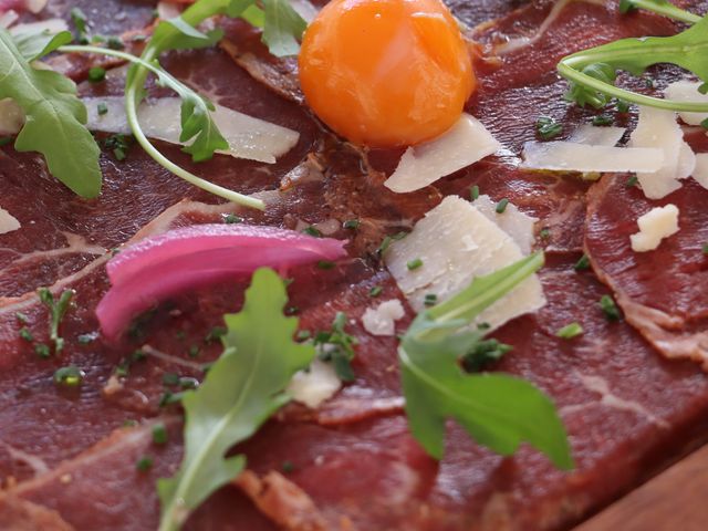 Carpaccio de boeuf maturé XXL, huile d'olives grand cru et vieux parmesan, jaune d'oeuf confit